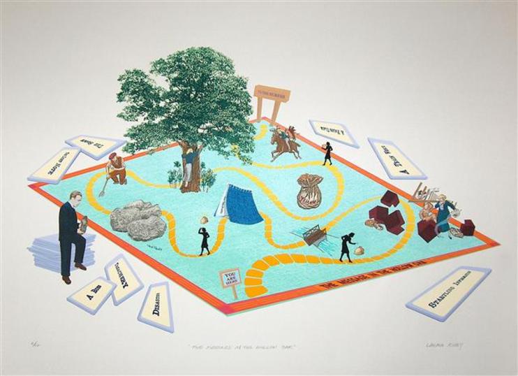This screenprint reveals a mystery played out on a favorite American pastime, the game board. The cards in the deck represent chapters from this particular Nancy Drew book, and images from the text appear at intervals along the "yellow brick road." The viewer enters into the work with the commonplace American popular culture locator, "You Are Here"—familiar at malls, zoos, museums and the like. The viewer playing this game then passes through the portal to the egress—a reference to P.T. Barnum's American Museum. Sam Spade, the detective in The Maltese Falcon, is located near important digging of clues.